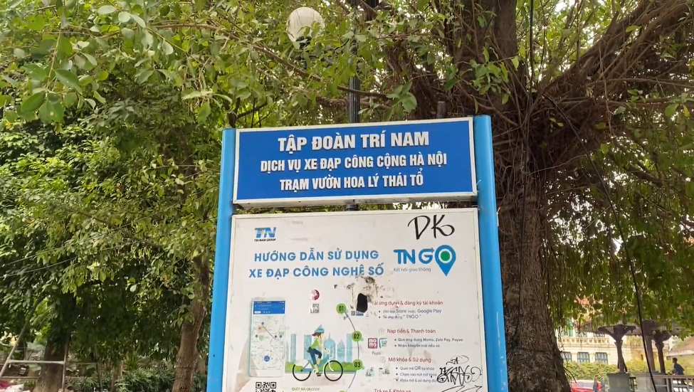Following the route along Hoàn Kiếm Lake, we stopped at Lý Thái Tổ Park, which conveniently hosts another public bicycle station. The lush greenery and unique architecture made it an ideal resting spot. While taking a break, we encountered a few foreign tourists who were intrigued by the public bikes.